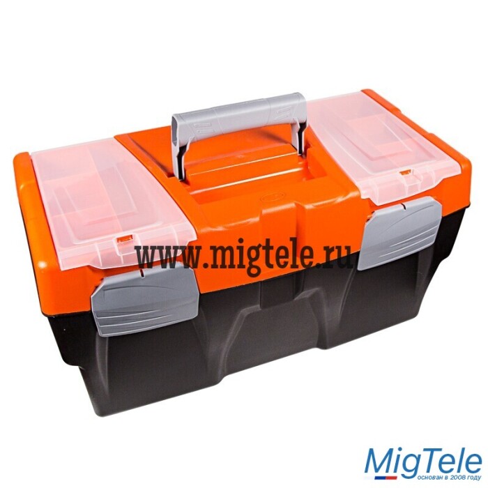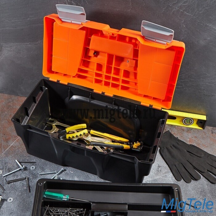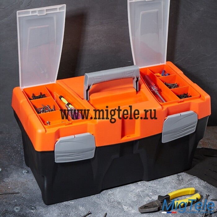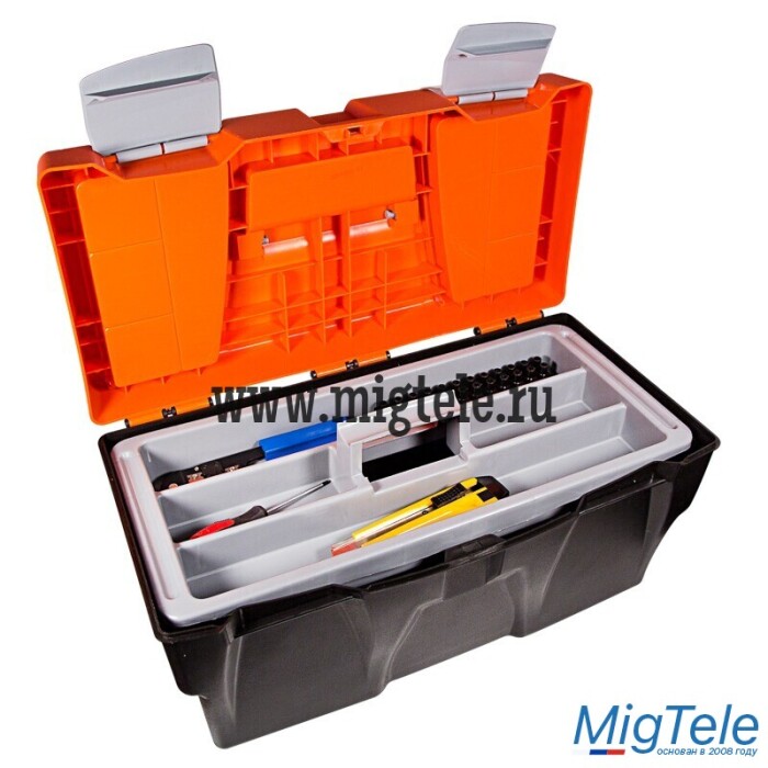 Ящик для инструментов PROconnect выполнен из прочного пластика. Обладает съемным 3-секционным лотком с удобной ручкой и 2 встроенными органайзерами с прозрачными крышками. Ящик предназначен для хранения и транспортировки инструментов, крепежных изделий, расходных материалов, в том числе различных предметов, схожих по габаритам. На крышке есть складная ручка. 2 удобных замка можно открыть одной рукой.