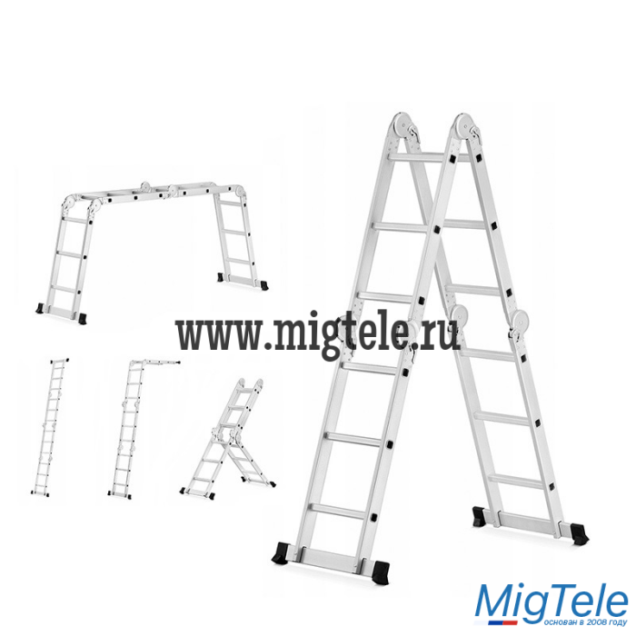 Алюминиевая лестница-трансформер повышенной прочности при небольшом весе обладает надежностью и высоким уровнем удобства во время использования. Большим преимуществом таких лестниц-трансформеров является количество возможных позиций, в которых их можно использовать и компактность, которая облегчает их перемещение и транспортировку. Регулировка производится при помощи стальных шарниров, которые обеспечивают надежную автоматическую фиксацию выбранного положения лестницы. Изделие оснащено противоскользящими рельефными ступенями, что гарантирует безопасность во время использования.