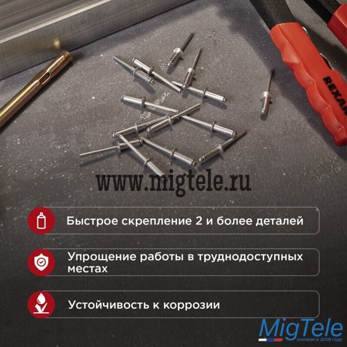 Крепеж используется совместно с заклепочниками REXANT арт. 12-5301, арт. 12-5302, арт. 12-5303.