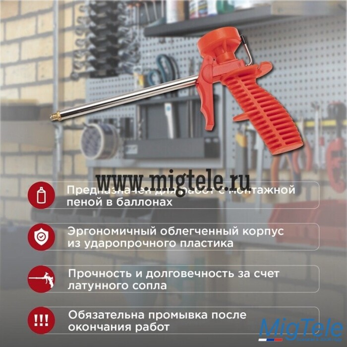 Пистолет REXANT предназначен для работ с монтажной пеной в баллонах, имеющих резьбовой соединитель. Используется для герметизации швов, трещин, стыков, проемов и пр.