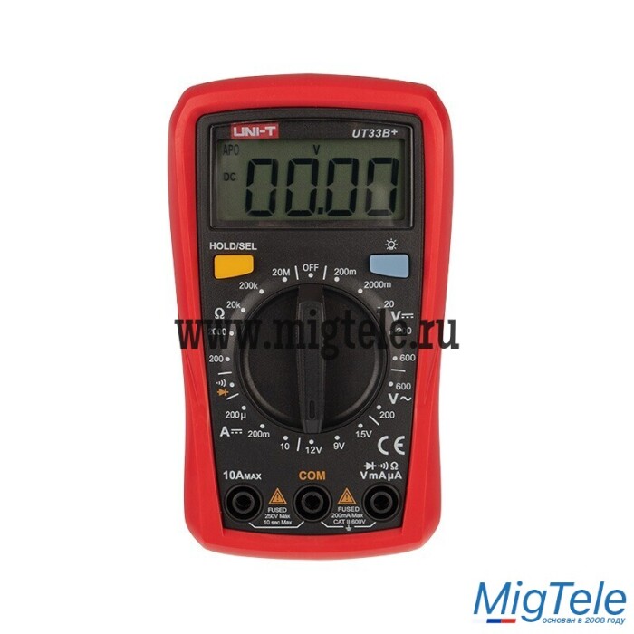 Прибор UT33B+ является портативным мультиметром, компактные размеры позволяют всегда носить его с собой. Но, несмотря на малые размеры, данный мультиметр обладает широким функционалом и это выгодно отличает его от других. Инженеры старались сделать прибор максимально удобным для использования. Выбор измеряемых величин и пределов измерений производится с помощью усиленного поворотного регулятора, благодаря которому исключается возможность случайного нажатия. Мультиметр UT33B+ оснащен функцией DATA HOLD, и зафиксировав результат измерений, вы в любое время сможете считать полученные значения. Дисплей прибора оснащен подсветкой, которая позволяет проводить измерения даже в слабоосвещенных местах.