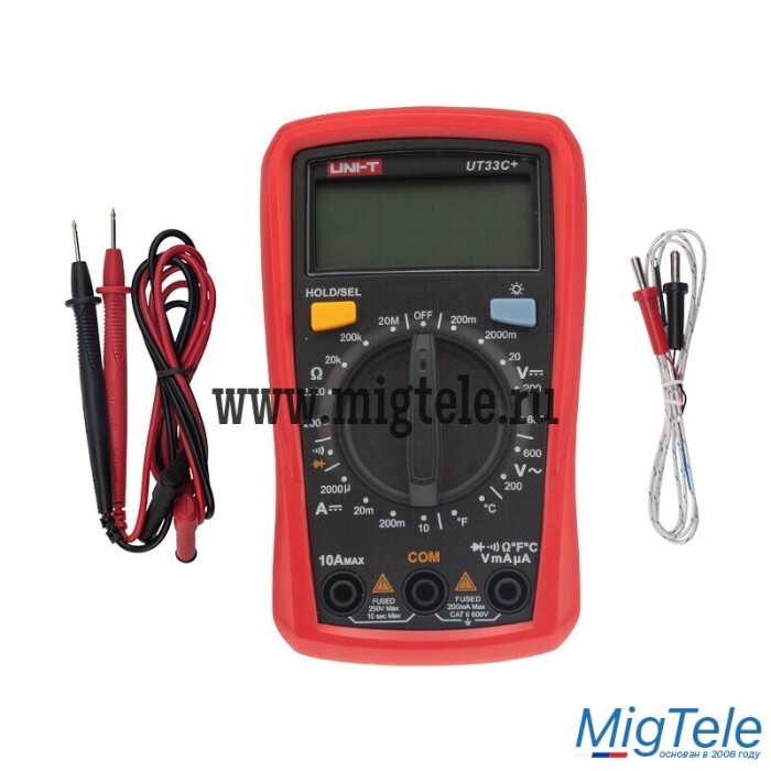 Прибор UT33C+ является портативным мультиметром, компактные размеры позволяют всегда носить его с собой. Но, несмотря на малые размеры, данный мультиметр обладает широким функционалом и это выгодно отличает его от других. С его помощью вы сможете измерить постоянное и переменное напряжение, постоянный ток, сопротивление и даже температуру. А также с помощью данного прибора можно проводить тестирование диодов и осуществлять прозвонку целостности цепи. Инженеры старались сделать прибор максимально удобным для использования. Выбор измеряемых величин и пределов измерений производится с помощью усиленного поворотного регулятора, благодаря которому исключается возможность случайного нажатия.
