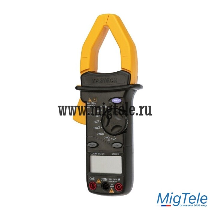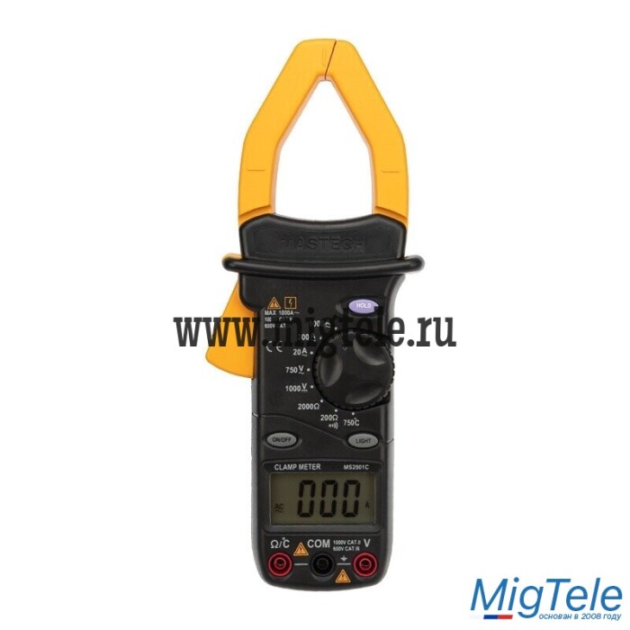 Токоизмерительные клещи MS2001 предназначены для измерения силы переменного тока, постоянного и переменного напряжения, температуры и сопротивления. С помощью данного прибора можно проверить качество соединений в электрической схеме. Последний полученный результат можно зафиксировать с помощью функции DATA HOLD. В условиях недостаточной видимости очень поможет подсветка ЖК дисплея. Питание от одной батареи 9 Вольт типа «Крона».
