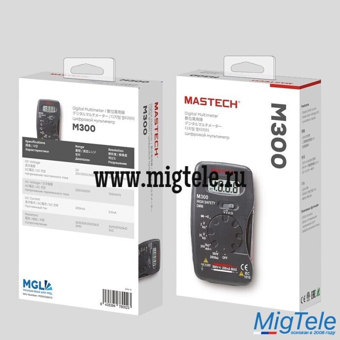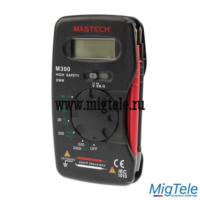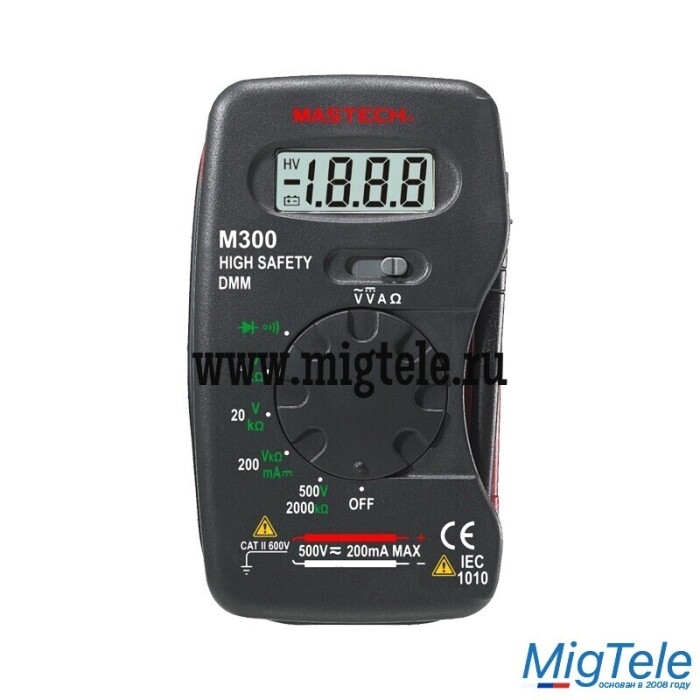 Мульти́метр — электроизмерительный прибор, который включает в себя определенный набор измеряемых параметров и функций. Прибор серии М300 представляет собой компактный, удобный измерительный прибор, который можно всегда держать под рукой, также рекомендуем ознакомиться с прибором М320(Арт.: 13-2009). С помощью данного прибора можно измерять постоянное и переменное напряжение, постоянный ток и сопротивление. А также, можно проводить тестирование диодов и прозвонку целостности цепи.