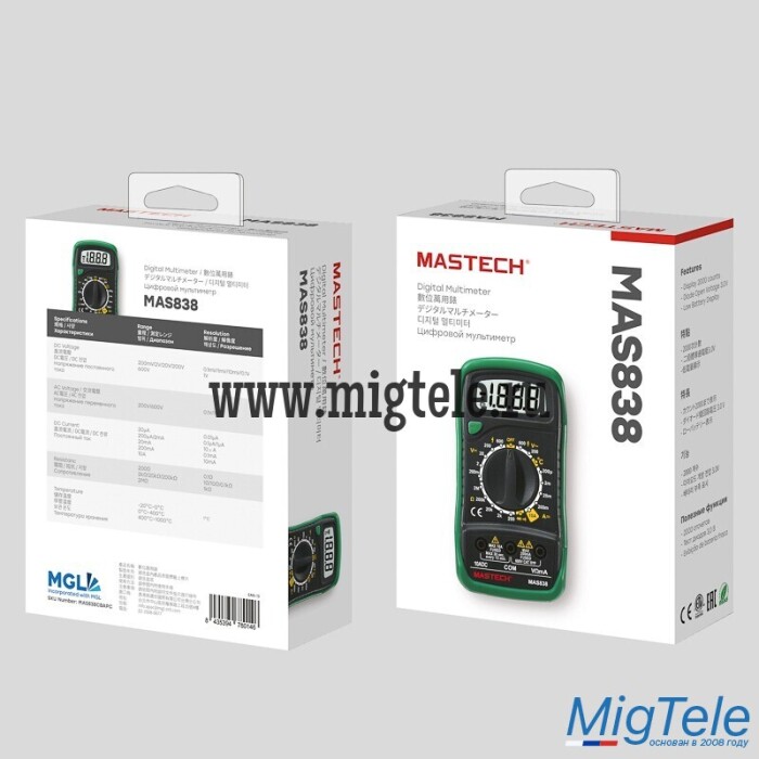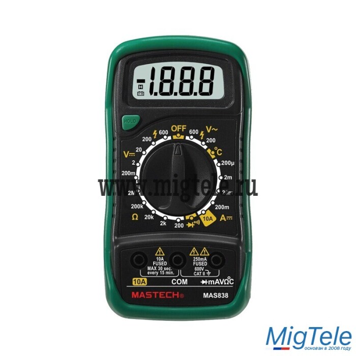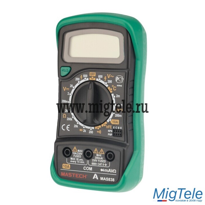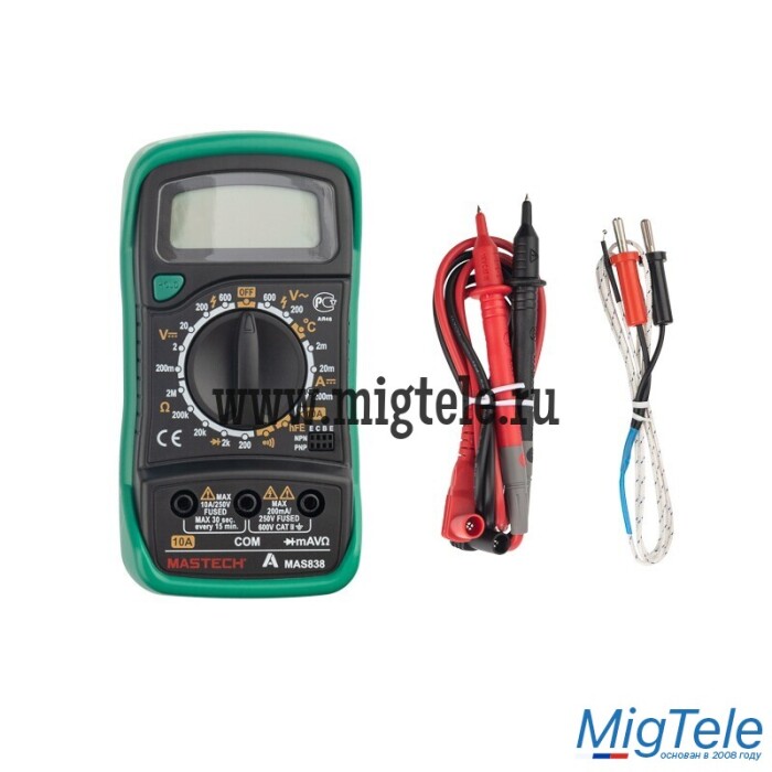 Портативный мультиметр MASTECH MAS838 – прибор, который измеряет постоянное и переменное напряжение, постоянный ток, сопротивление в цепи, температуру. С помощью данного устройства можно проводить тестирование диодов и прозвонку целостности цепи. Прибор оснащен функцией удержания результата измерений DATA HOLD: используется в случае проведения работ в труднодоступных местах. Поворотный регулятор для выбора измеряемых величин и их пределов усилен для исключения возможности случайного нажатия. Мультиметр укомплектован термопарой «К»-типа, измерительными щупами, батареей и руководством по эксплуатации.