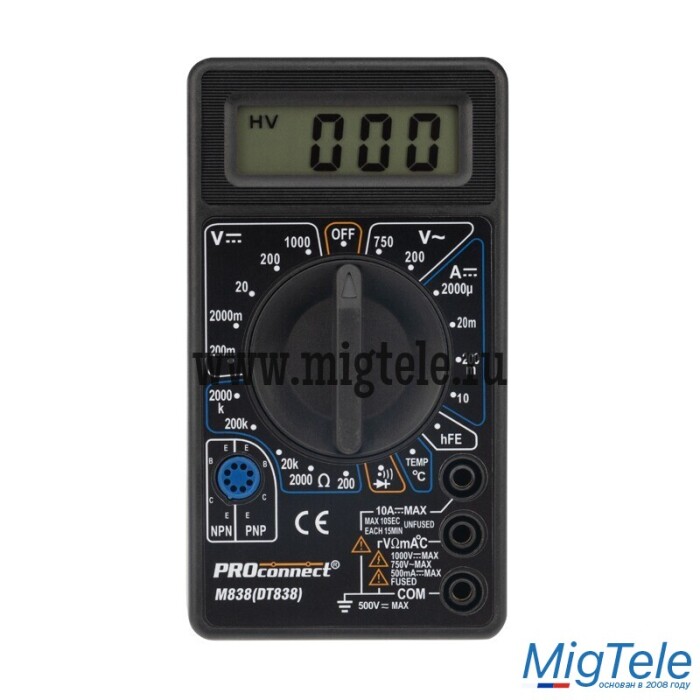 Мульти́метр — электроизмерительный прибор, который включает в себя несколько функций и набор измеряемых параметров. Все приборы серии M838 измеряют постоянное и переменное напряжение, постоянный ток, сопротивление в цепи и даже температуру — модель М838. А также с помощью данного прибора можно проводить тестирование диодов.