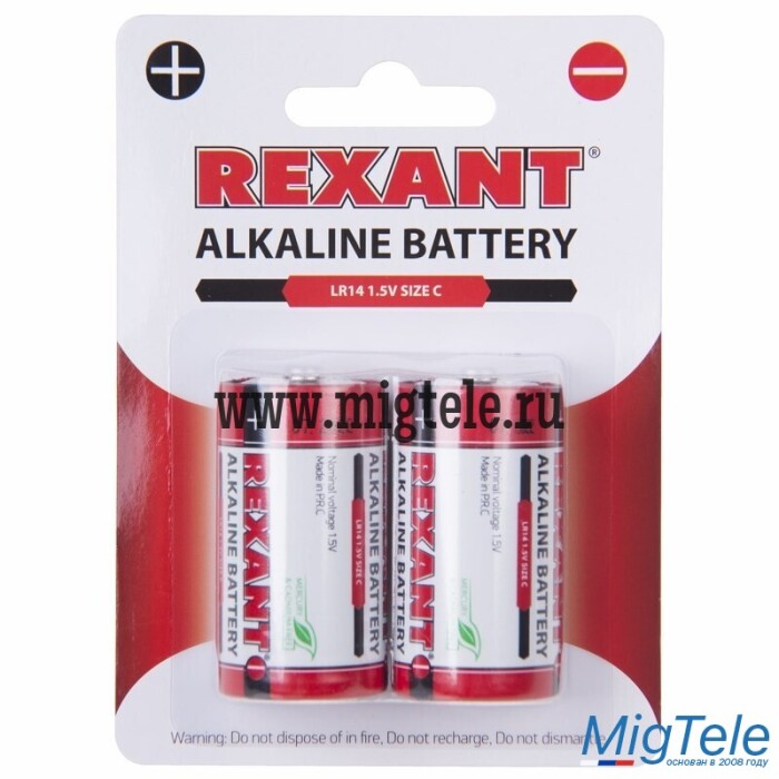 Алкалиновые батарейки тип С/LR14 REXANT 2 шт. в блистерной упаковке.