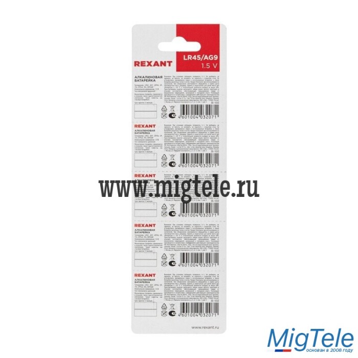 Батарейка LR45, AG9, LR936, G9, 194, GP94A, 394, SR936W REXANT