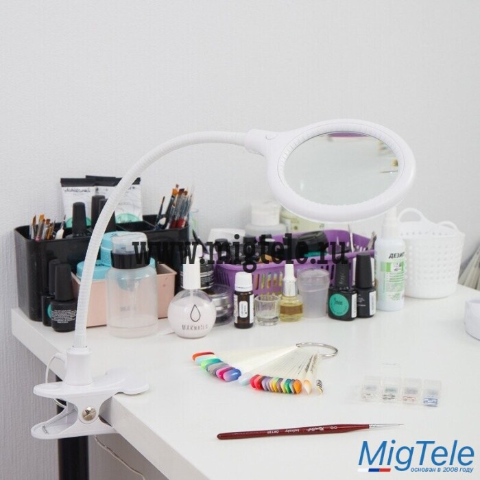 Лупа настольная, малая, 3D, с подсветкой, 30 LED (прищепка), белая REXANT. Предназначена для визуального увеличения различных мелких предметов или их фрагментов. Используется во многих областях жизнедеятельности человека: косметологии, ногтевом сервисе, ювелирном деле и в быту. Оптическая сила линзы – 3 диоптрии, что обеспечивает увеличение в 1,75 раза. Размер линзы: 95мм.