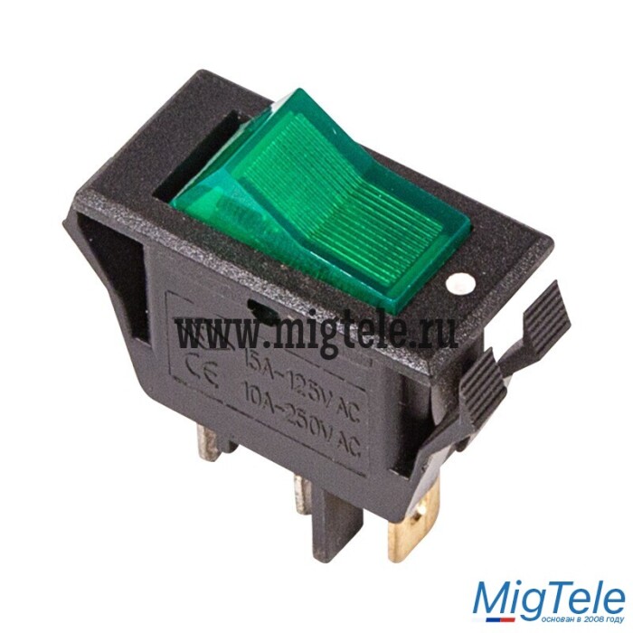 Выключатель клавишный 250V 15А (3с) ON-OFF зеленый с подсветкой предназначен для коммутации электрических цепей переменного тока напряжением до 250В. Клавишные (Рокерные) выключатели применяются в качестве комплектующих изделий различного электрооборудования (в сетевых фильтрах и удлинителях, аудио-оборудовании, блоках питания, электроустановках на различных производствах, автомобилях, и многих других местах). Такой клавишный переключатель имеет два положения. Принцип действия основан на перемещении клавиши в одну из позиций. Для переключения в нужное положение требуется приложить некоторые усилия на клавишу. Монтаж осуществляется без применения винтов на плоских панелях толщиной от 0.8мм до 3мм. Подключение контактов осуществляется плоской клеммой 6.6мм либо с помощью пайки.