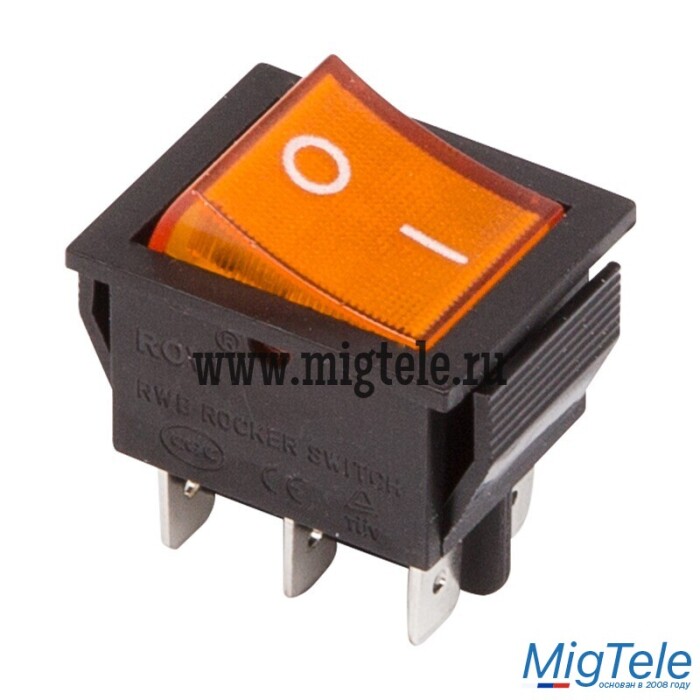 Переключатель клавишный 250V 15А (6с) ON-ON желтый с подсветкой предназначен для коммутации электрических цепей переменного тока напряжением до 250В. Клавишные (Рокерные) выключатели применяются в качестве комплектующих изделий различного электрооборудования (в сетевых фильтрах и удлинителях, аудио-оборудовании, блоках питания, электроустановках на различных производствах, автомобилях, и многих других местах). Такой клавишный переключатель имеет два положения. Принцип действия основан на перемещении клавиши в одну из позиций. Для переключения в нужное положение требуется приложить некоторые усилия на клавишу. Монтаж осуществляется без применения винтов на плоских панелях толщиной от 0.8мм до 3мм. Подключение контактов осуществляется плоской клеммой 6.6мм либо с помощью пайки.