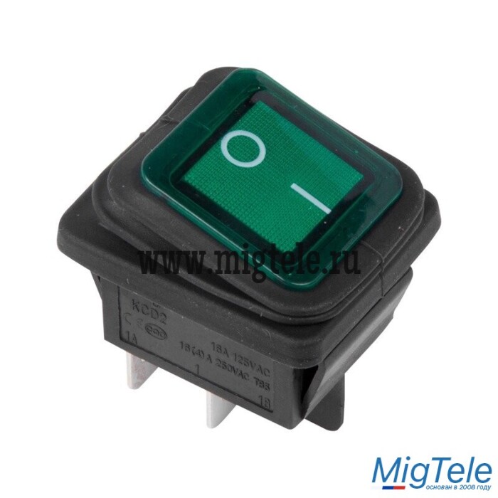 Выключатель клавишный 250V 15А (4с) ON-OFF зеленый с подсветкой ВЛАГОЗАЩИТА предназначен для коммутации электрических цепей переменного тока напряжением до 250В в условиях повышенной влажности. Клавишные (Рокерные) выключатели применяются в качестве комплектующих изделий различного электрооборудования (в сетевых фильтрах и удлинителях, аудио-оборудовании, блоках питания, электроустановках на различных производствах, автомобилях, и многих других местах). Защитная оболочка клавиши обеспечивает влаго и пылезащиту механизма переключения. Принцип действия основан на перемещении клавиши в одну из позиций. Для переключения в нужное положение требуется приложить некоторые усилия на клавишу. Монтаж осуществляется без применения винтов на плоских панелях толщиной от 0.8мм до 3мм. Подключение контактов осуществляется плоской клеммой 6.6мм либо с помощью пайки.