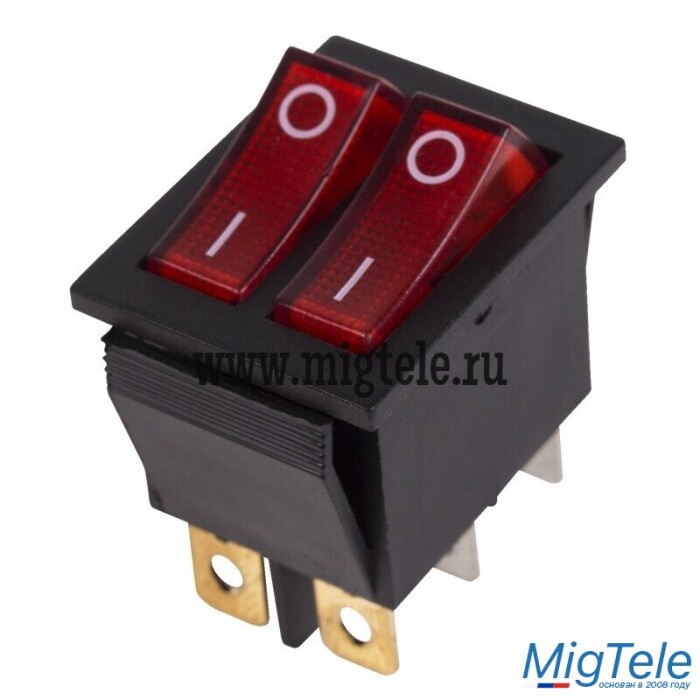 Выключатель клавишный 250V 15А (6с) ON-OFF красный с подсветкой ДВОЙНОЙ предназначен для коммутации электрических цепей переменного тока напряжением до 250В. Клавишные (Рокерные) выключатели применяются в качестве комплектующих изделий различного электрооборудования (в сетевых фильтрах и удлинителях, аудио-оборудовании, блоках питания, электроустановках на различных производствах, автомобилях, и многих других местах). Такой клавишный переключатель имеет два положения и две клавиши, что позволит раздельно коммутировать контактные группы. Принцип действия основан на перемещении клавиши в одну из позиций. Для переключения в нужное положение требуется приложить некоторые усилия на клавишу. Монтаж осуществляется без применения винтов на плоских панелях толщиной от 0.8мм до 3мм. Подключение контактов осуществляется плоской клеммой 6.6мм либо с помощью пайки.