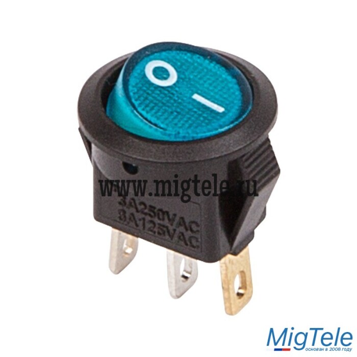 Выключатель клавишный круглый 250V 3А (3с) ON-OFF синий с подсветкой Micro предназначен для коммутации электрических цепей переменного тока напряжением до 250В. Клавишные (Рокерные) выключатели применяются в качестве комплектующих изделий различного электрооборудования (в сетевых фильтрах и удлинителях, аудио-оборудовании, блоках питания, электроустановках на различных производствах, автомобилях, и многих других местах). Такой клавишный переключатель имеет два положения. Принцип действия основан на перемещении клавиши в одну из позиций. Для переключения в нужное положение требуется приложить некоторые усилия на клавишу. Монтаж осуществляется без применения винтов на плоских панелях толщиной от 0.8мм до 3мм. Подключение контактов осуществляется плоской клеммой либо с помощью пайки.