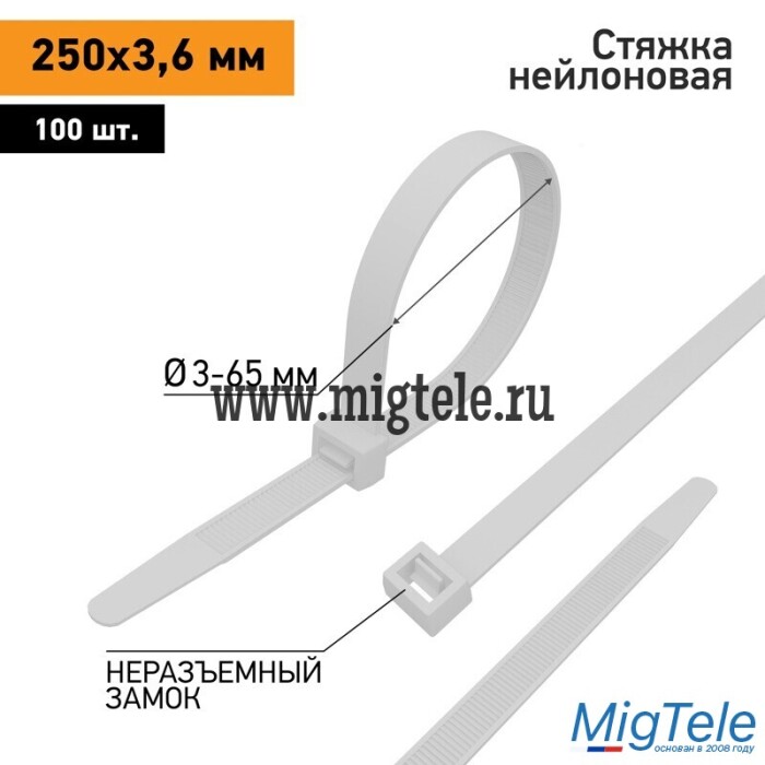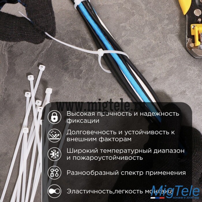 Описание Rexant 57-0250 Хомут-стяжка кабельная нейлоновая 250x3,6мм