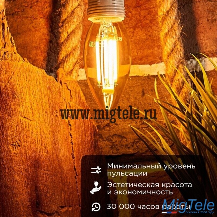 Филаментная лампа имеет форму, имитирующую пламя свечи, за счет чего и получила свое название. Обеспечивает качественное основное и дизайнерское освещение различных помещений. За счет распространения света во всех направлениях имеет широкий угол освещения и может быть установлена любым способом.