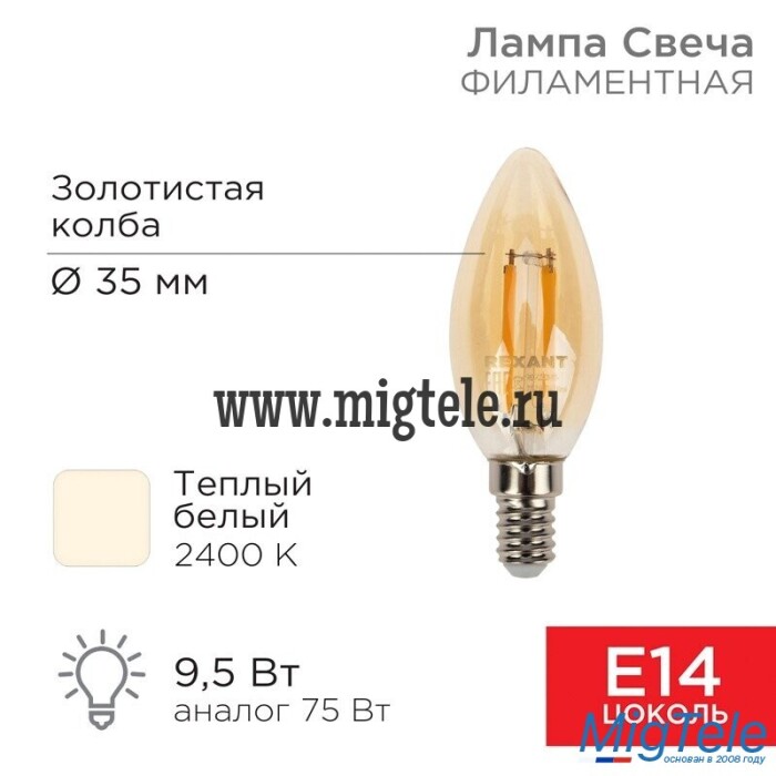 Описание Rexant 604-099 Лампа филаментная Свеча CN35 9.5 Вт