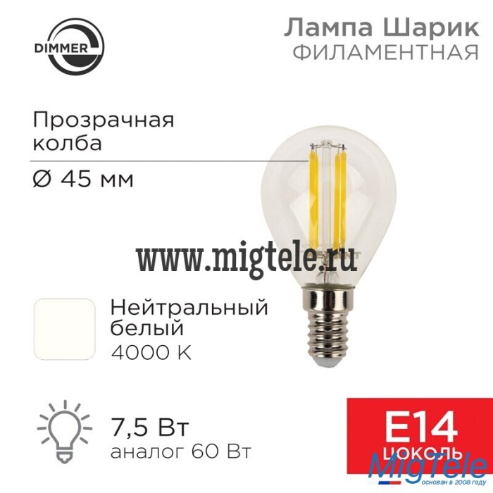 Также лампа равномерно распределяет температуру, благодаря чему не нагревается. Обладает мощностью в 7,5Вт и цоколем Е14.