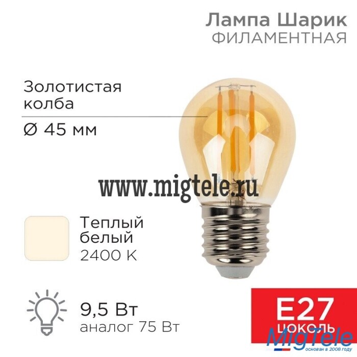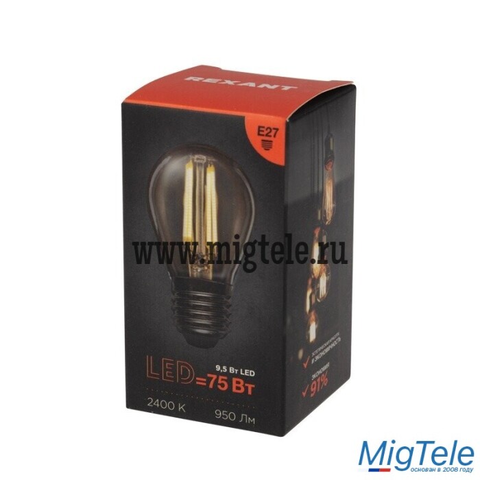 Описание Rexant 604-138 Лампа филаментная Шарик GL45 9.5 Вт