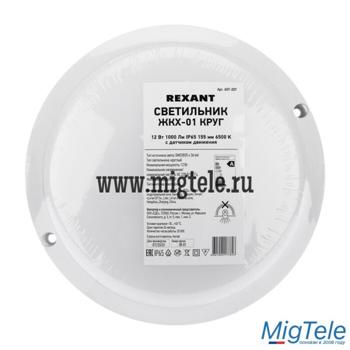 Светильник REXANT серии ЖКХ оснащен источником света типа SMD2835 с номинальной мощностью 12 Вт и световым потоком 1000 Лм.