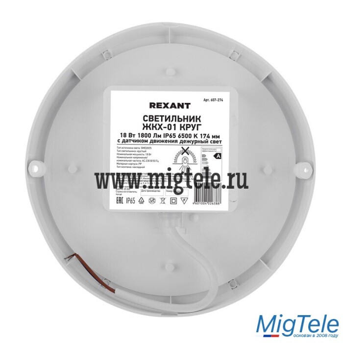 Светильник REXANT серии ЖКХ оснащен долговечным светодиодным источником света номинальной мощностью 18 Вт и световым потоком 1800 Лм.