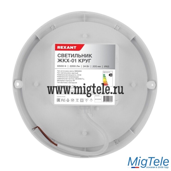 Светильник REXANT серии ЖКХ оснащен долговечным светодиодным источником света номинальной мощностью 24 Вт и световым потоком 2200 Лм.