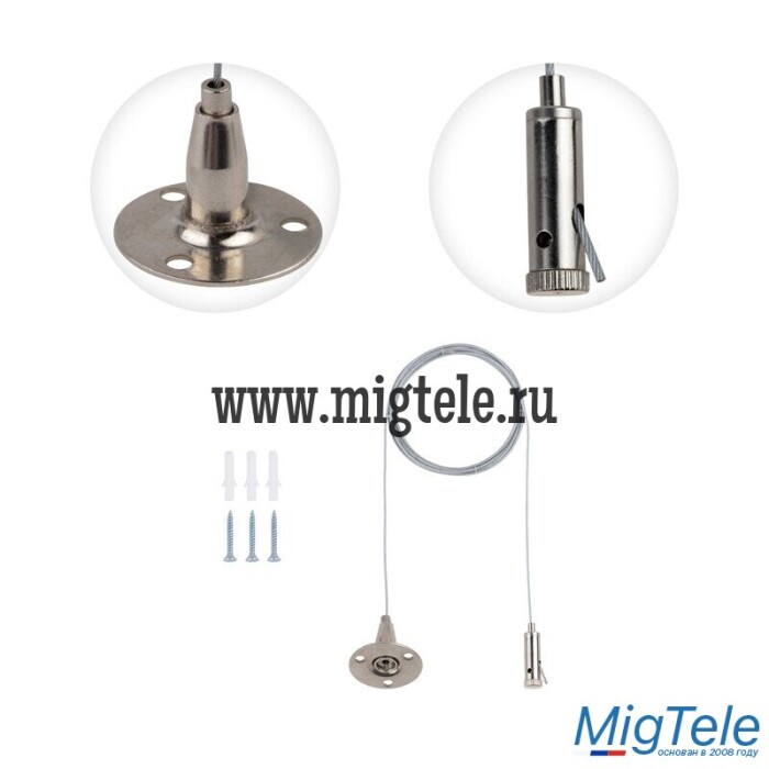 Трос изготовлен из стали и оснащен самозажимными держателями, посредством которых регулируется длина подвеса.