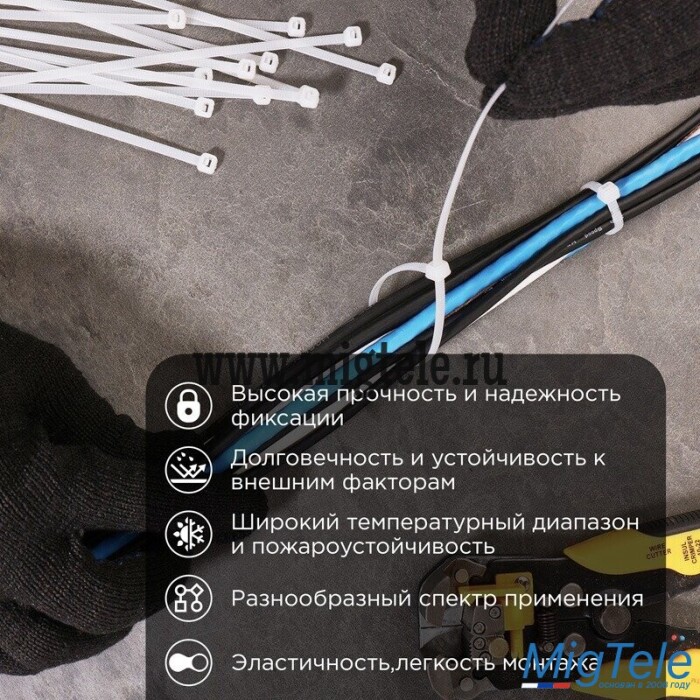 Хомут нейлоновый «Тройной замок» является фиксирующим приспособлением белого цвета размером 250x3,6 мм, которое используется для крепления или соединения в жгут кабелей, проводов или труб. Применяется при монтаже структурированных кабельных систем.