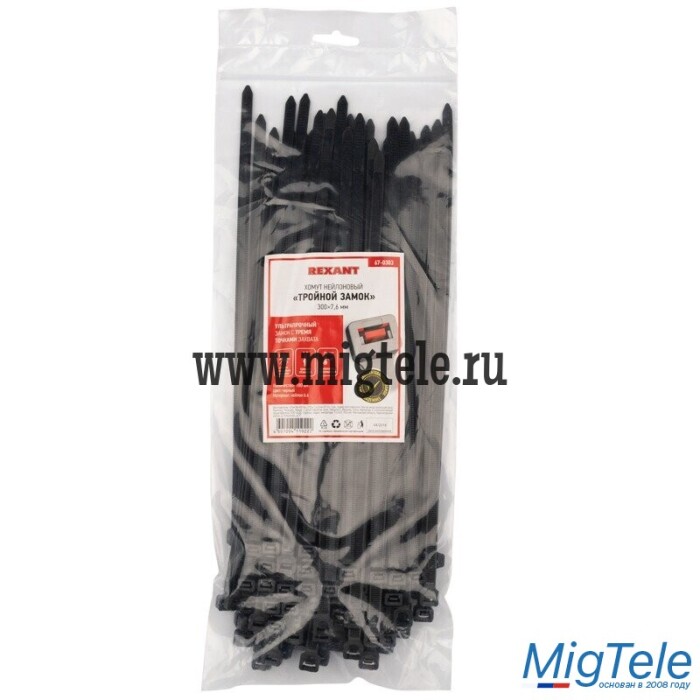 Хомут нейлоновый с тройным замком 300x7,6мм черного цвета позволяет зафиксировать провода, кабели и трубы в необходимом положении, собрать их в жгут, прикрепить к какому-либо основанию. Изделия имеют широкую область применения, в связи с чем используются во многих сферах жизнедеятельности и в быту.