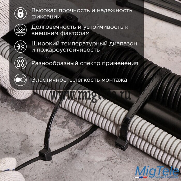 Хомут нейлоновый с тройным замком 350x4,8мм черного цвета позволяет зафиксировать провода, кабели и трубы в необходимом положении, собрать их в жгут, прикрепить к какому-либо основанию. Изделия имеют широкую область применения, в связи с чем используются во многих сферах жизнедеятельности и в быту.