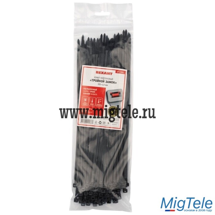 Описание Rexant 67-1302 Хомут-стяжка с тройным замком 300x4,8мм