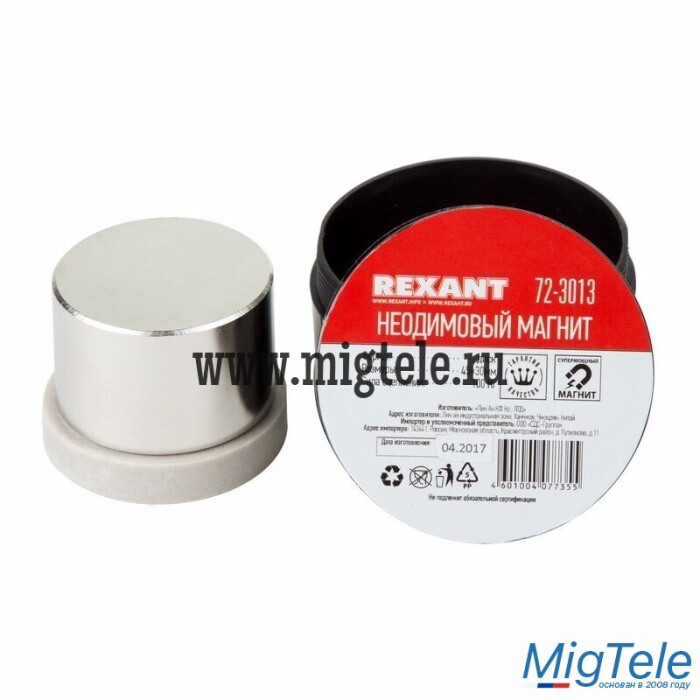 Постоянный редкоземельный неодимовый магнит REXANT состоит из сплава неодима, бора и железа. Известен своей мощностью притяжения и высокой стойкостью к размагничиванию. Применяется в различных областях промышленности, медицины, в быту и электронике.