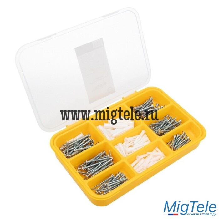 Набор универсального крепежа для внутренних работ. Возможно использование в следующих основаниях: дерево, бетон, кирпичные стены.