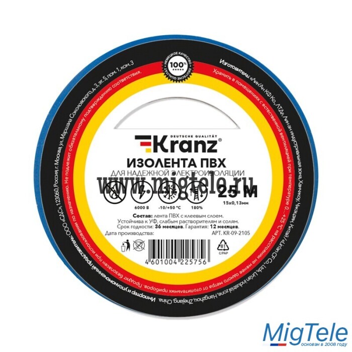 Изолента KRANZ предназначена для электрической изоляции, цветной маркировки, соединения, защиты от внешних факторов и герметизации кабелей, проводов и шнуров.