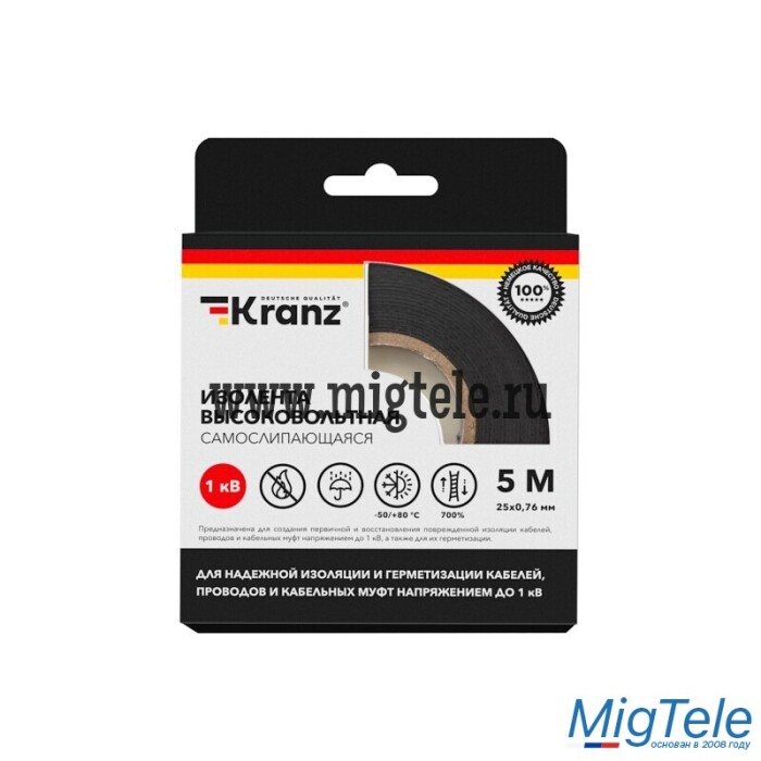 Высоковольтная самослипающаяся изоляционная лента KRANZ предназначена для создания первичной и восстановления поврежденной изоляции кабелей, проводов и кабельных муфт напряжением до 25 кВ, а также для их герметизации.