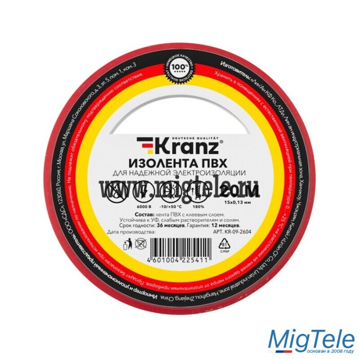 Изолента KRANZ предназначена для электрической изоляции, цветной маркировки, соединения, защиты от внешних факторов и герметизации кабелей, проводов и шнуров.