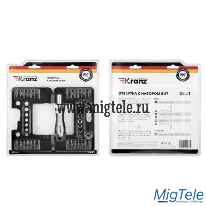 Биты набора выполнены из хромованадиевой стали. Твердость бит: 51-56 HRC.