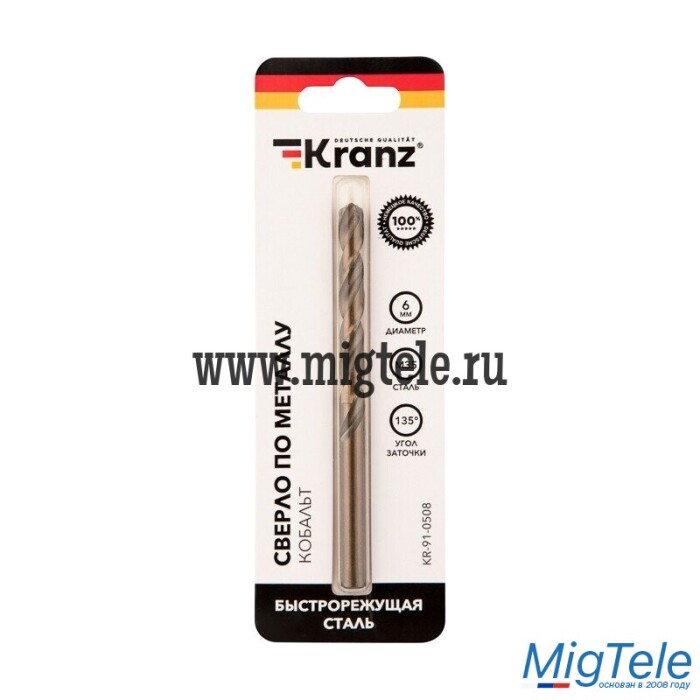 Сверло по металлу KRANZ соответствует стандартам профессиональной оснастки и используется во время различных ремонтных работ. Предназначено для сверления отверстий в нержавеющей и жаростойкой стали, легированной и нелегированной стали, сером чугуне, стальном литье, кислотостойкой стали, титане и титановых сплавах при помощи дрели с цилиндрическим креплением, которое используется в большинстве электроинструментов бытового и профессионального назначения. Изделие выполнено из качественной стали с добавлением 5% кобальта, что обеспечивает долгий ресурс работы и высокую производительность. Конструкция со стабилизирующей спиралью сохраняет точное положение оснастки во время сверления, что гарантирует ровные и аккуратные отверстия. Заточка режущей части под углом 135 градусов способствует эффективному входу в материал, что увеличивает цикл службы оснастки и уменьшает износ бура.