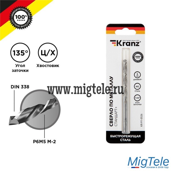 Сверло по металлу KRANZ соответствует стандартам профессиональной оснастки и используется во время различных ремонтных работ. Предназначено для сверления отверстий в нержавеющей и жаростойкой стали, легированной и нелегированной стали, сером чугуне, стальном литье, кислотостойкой стали, металлокерамике, цветных металлах и твердой пластмассе при помощи дрели с цилиндрическим креплением, которое используется в большинстве электроинструментов бытового и профессионального назначения. Изделие выполнено из качественной стали, что обеспечивает долгий ресурс работы и высокую производительность, а также препятствует быстрому нагреву во время использования. Конструкция со стабилизирующей спиралью сохраняет точное положение оснастки во время сверления, что гарантирует ровные и аккуратные отверстия. Заточка режущей части под углом 135 градусов способствует эффективному входу в материал, что увеличивает цикл службы оснастки и уменьшает износ бура. Оснастка выпускается на современном производстве, что снижает возможность изготовления бракованных изделий. Технологичные сверла рассчитаны на долгий срок службы, а стандарт DIN 338 гарантирует качество. Ресурс использования заметно увеличивается при использовании СОЖ. Диаметр хвостовика соответствует диаметру сверла.