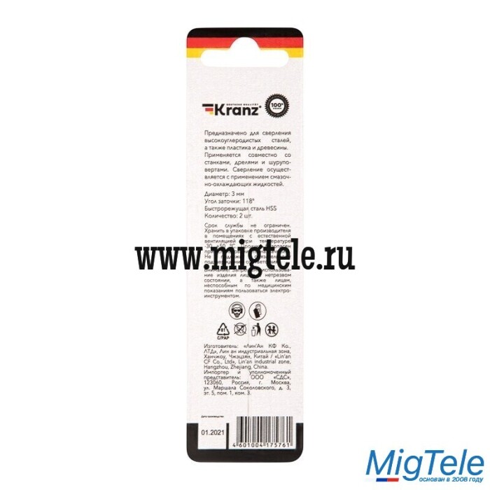 Сверло KRANZ соответствует стандартам профессиональной оснастки. Предназначено для сверления отверстий в мягких и средних по твердости металлах, пластике и различных породах дерева при помощи дрели или станка с цилиндрическим креплением, которое используется в большинстве электроинструментов бытового и профессионального назначения. Изделие выполнено из качественной инструментальной стали, что обеспечивает долгий ресурс работы и высокую производительность. Конструкция со стабилизирующей спиралью сохраняет точное положение оснастки во время сверления, что гарантирует ровные и аккуратные отверстия без трещин и сколов. Заточка режущей части под углом 118 градусов способствует эффективному входу в материал, что увеличивает цикл службы оснастки и уменьшает износ бура. Диаметр хвостовика соответствует диаметру сверления.