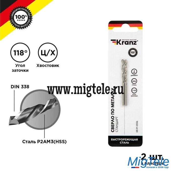 Описание Rexant KR-91-0556 Сверло по металлу 3,0х61х33 мм HSS