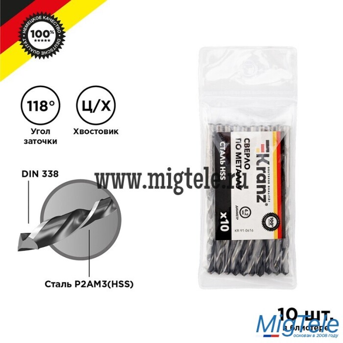 Сверло KRANZ соответствует стандартам профессиональной оснастки. Предназначено для сверления отверстий в мягких и средних по твердости металлах, пластике и различных породах дерева при помощи дрели или станка с цилиндрическим креплением, которое используется в большинстве электроинструментов бытового и профессионального назначения. Изделие выполнено из качественной инструментальной стали, что обеспечивает долгий ресурс работы и высокую производительность. Конструкция со стабилизирующей спиралью сохраняет точное положение оснастки во время сверления, что гарантирует ровные и аккуратные отверстия без трещин и сколов. Заточка режущей части под углом 118 градусов способствует эффективному входу в материал, что увеличивает цикл службы оснастки и уменьшает износ бура. Диаметр хвостовика соответствует диаметру сверления.