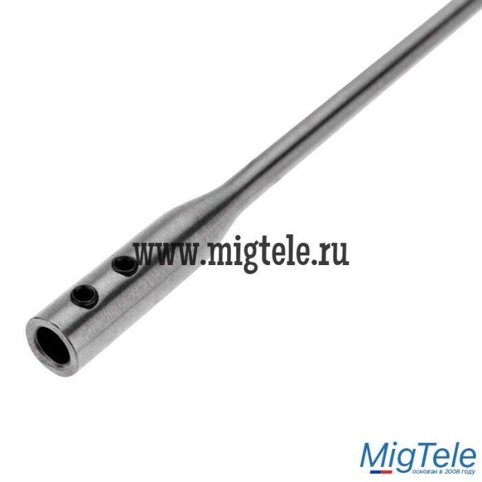 Изготовлен из высококачественной углеродистой стали. Имеет шестигранное посадочное отверстие с двумя поперечными крепежными винтами для надежной фиксации хвостовиков перовых сверл. Хвостовик удлинителя также имеет шестигранную форму, что предотвращает поворот сверла в патроне дрели.