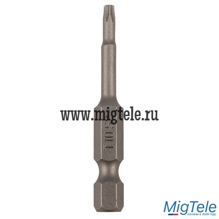 Бита Torx T-10х50 мм (насадка) для закручивания крепежа (шурупы, винты). Произведена из стали S2 и закалена до оптимальной твердости, чем обусловлен высокий ресурс. Шестигранный хвостовик (Е6,3) обеспечивает быструю и надежную фиксацию в шуруповертах. Также используется с отверткой для бит.