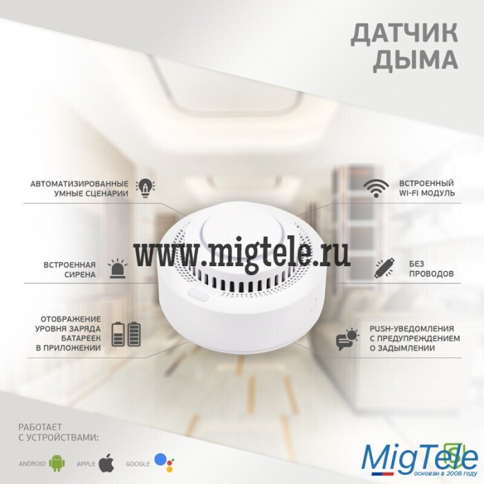Датчик предназначен для контроля задымления и предотвращения пожара в помещениях разного типа. При обнаружении дыма устройство через несколько секунд отправляет пользователю PUSH-уведомление на смартфон и издает звуковой сигнал, что позволяет минимизировать угрозу возгорания и возможный ущерб.
